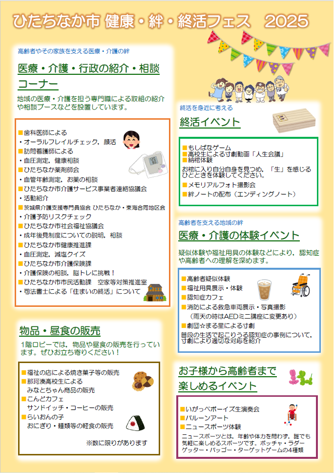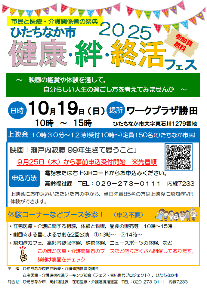 お知らせ 2025年09月20日(土曜日) 市民の皆さまへ ひたちなか市 2025 健康・絆・終活フェス 参加費無料 上映会へのお申し込みは、電話またはQRコードからお申し込みください。 このチラシをダウンロードする « 令和6年度 ひたちなか市 市民健康講座